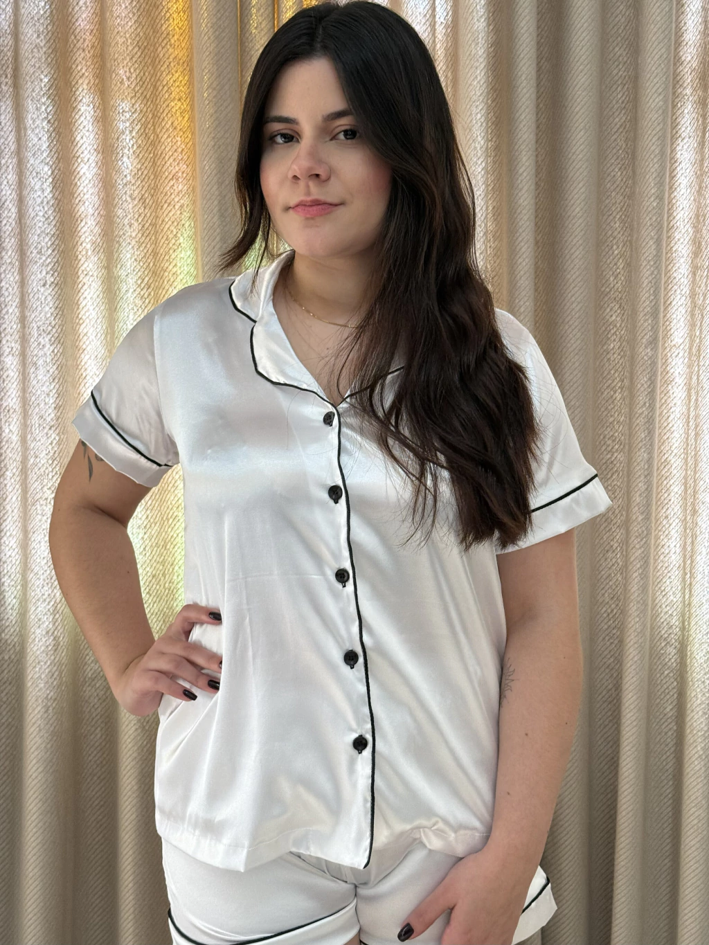 Pijama Americano Cetim Branco Liso - Manga Curta com Short e Botões